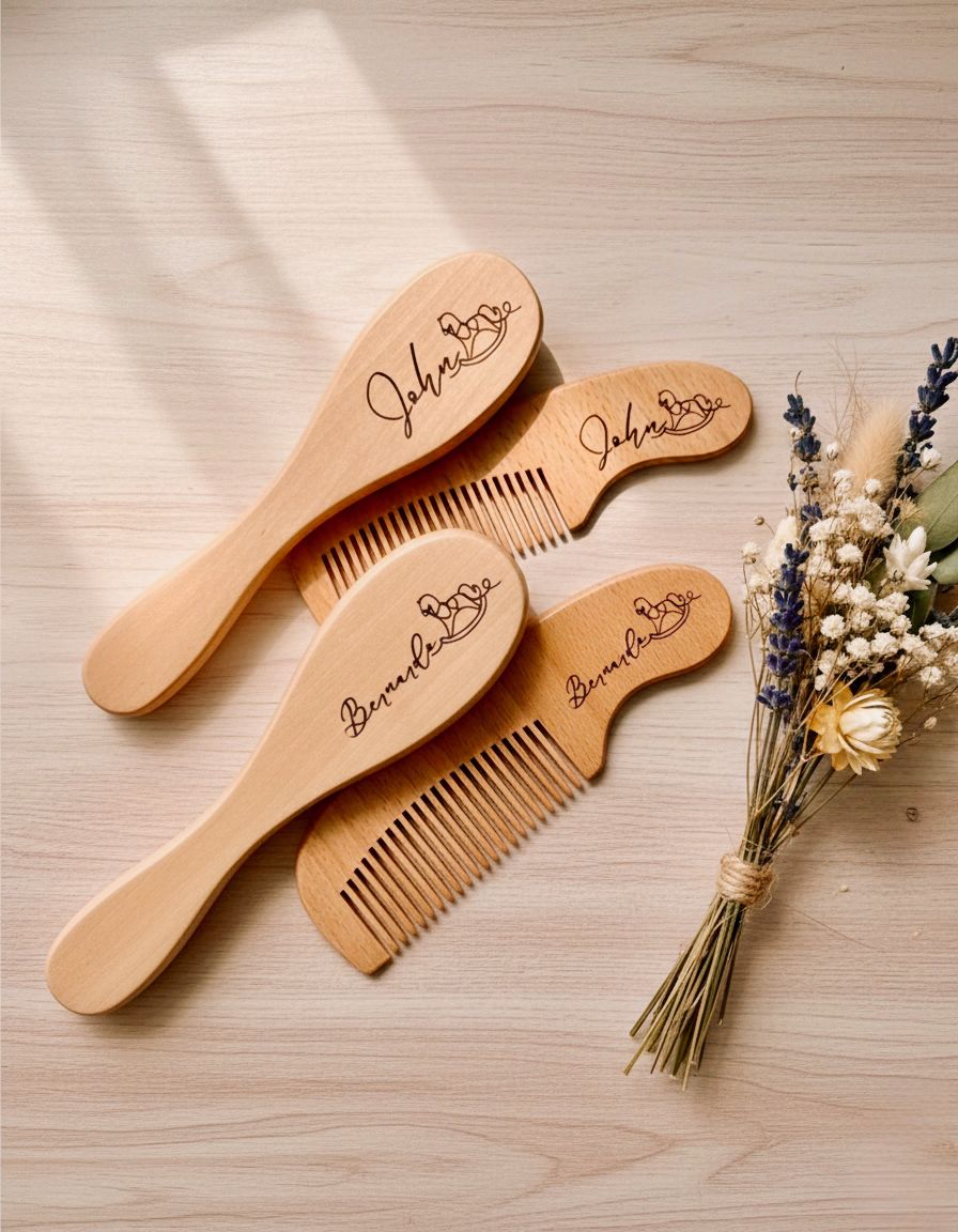 Made from natural wood and carefully laser engraved with the baby’s name, this kit is gentle on sensitive scalps and perfect for daily use or as a meaningful keepsake gift.