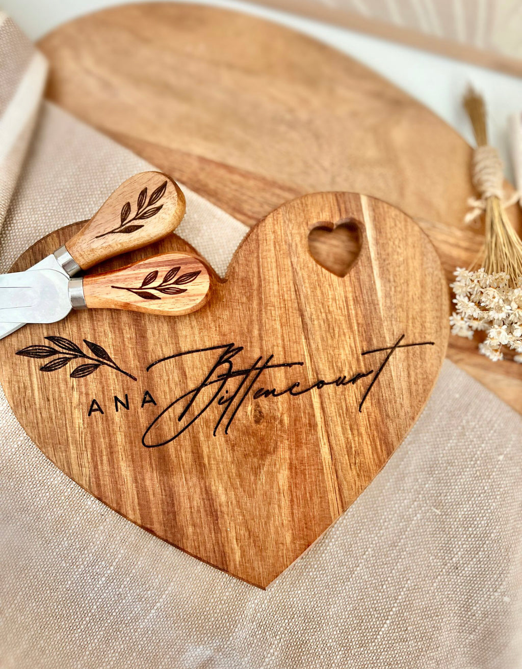 Heart-shaped charcuterie board + 2 forks (all laser-engraved)
