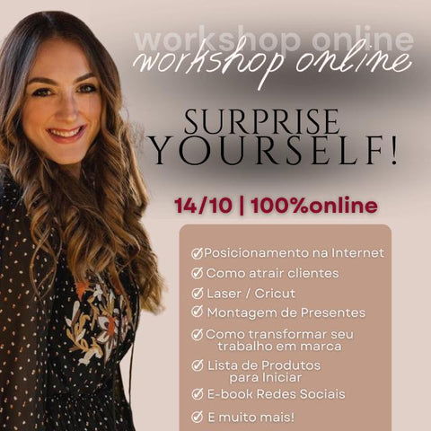 No workshop SURPRISE YOURSELF!, eu vou compartilhar a minha jornada — de quando comecei vendendo caneca por US$10 (e vendi MUITO ta?!🤭🤑), até construir a OH SURPRISE! — e mostre que você também pode dar seu primeiro passo!